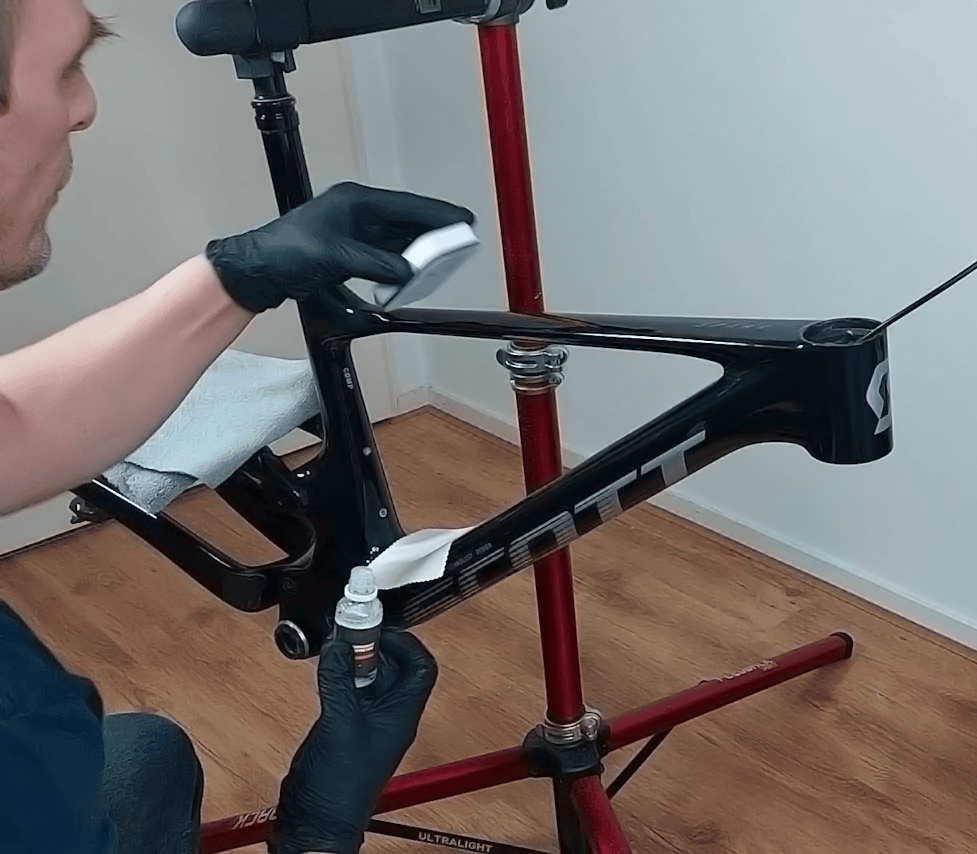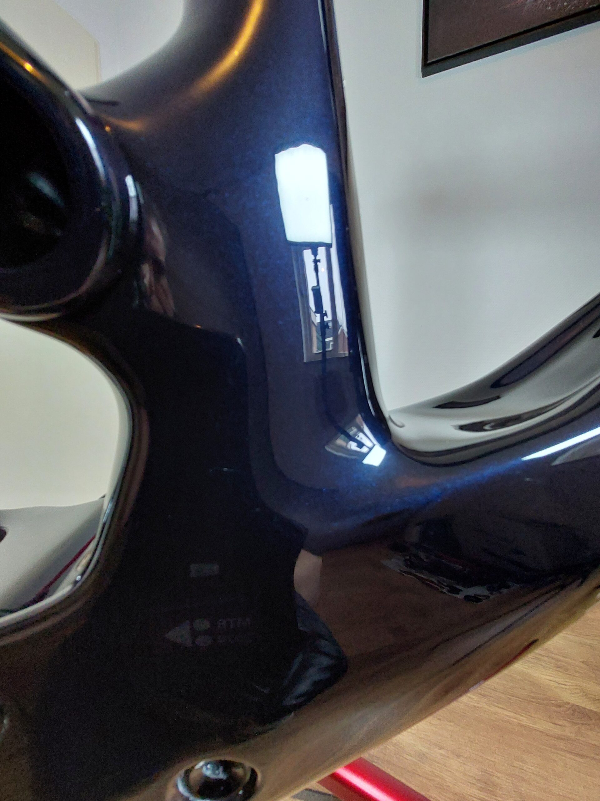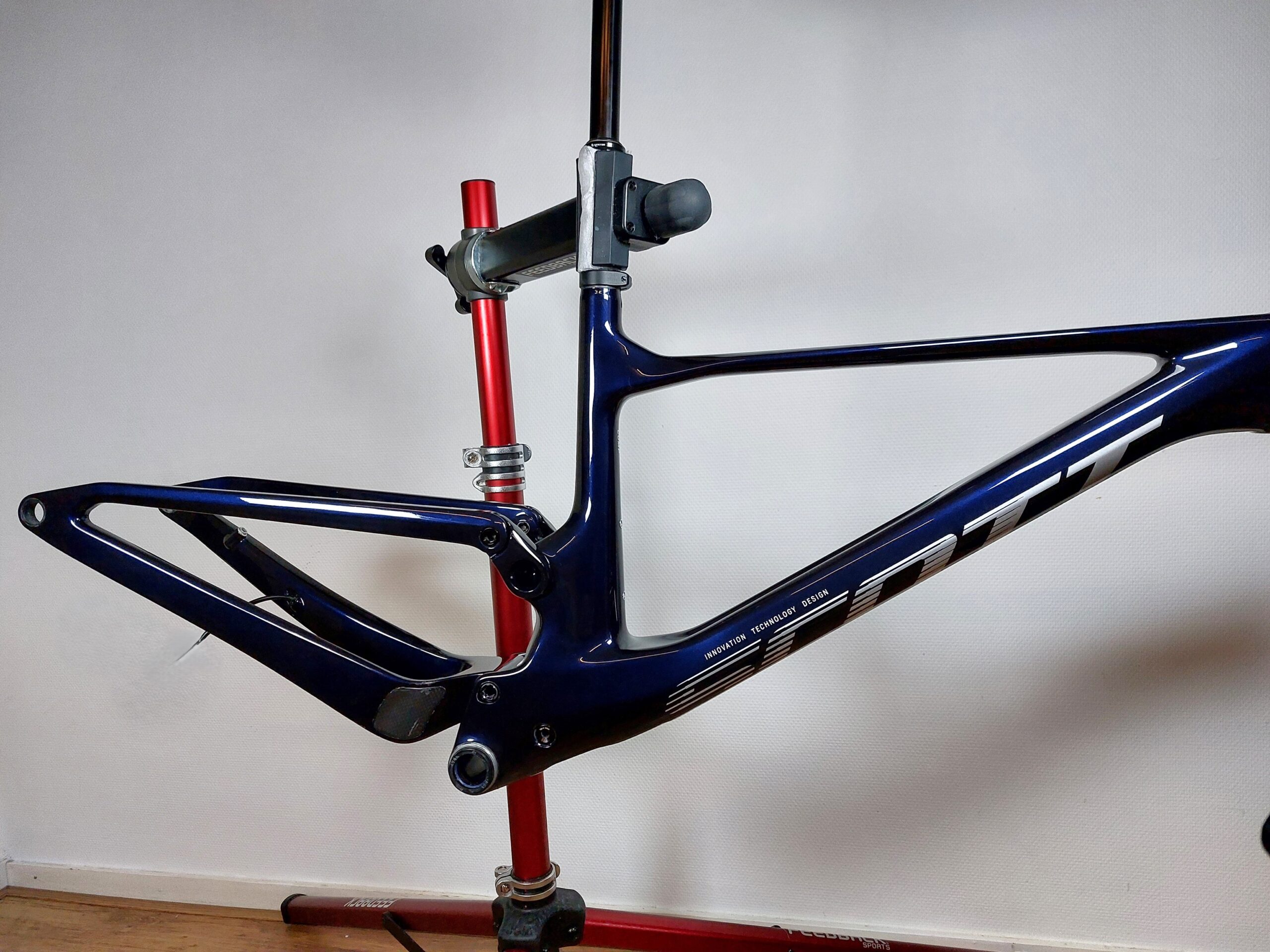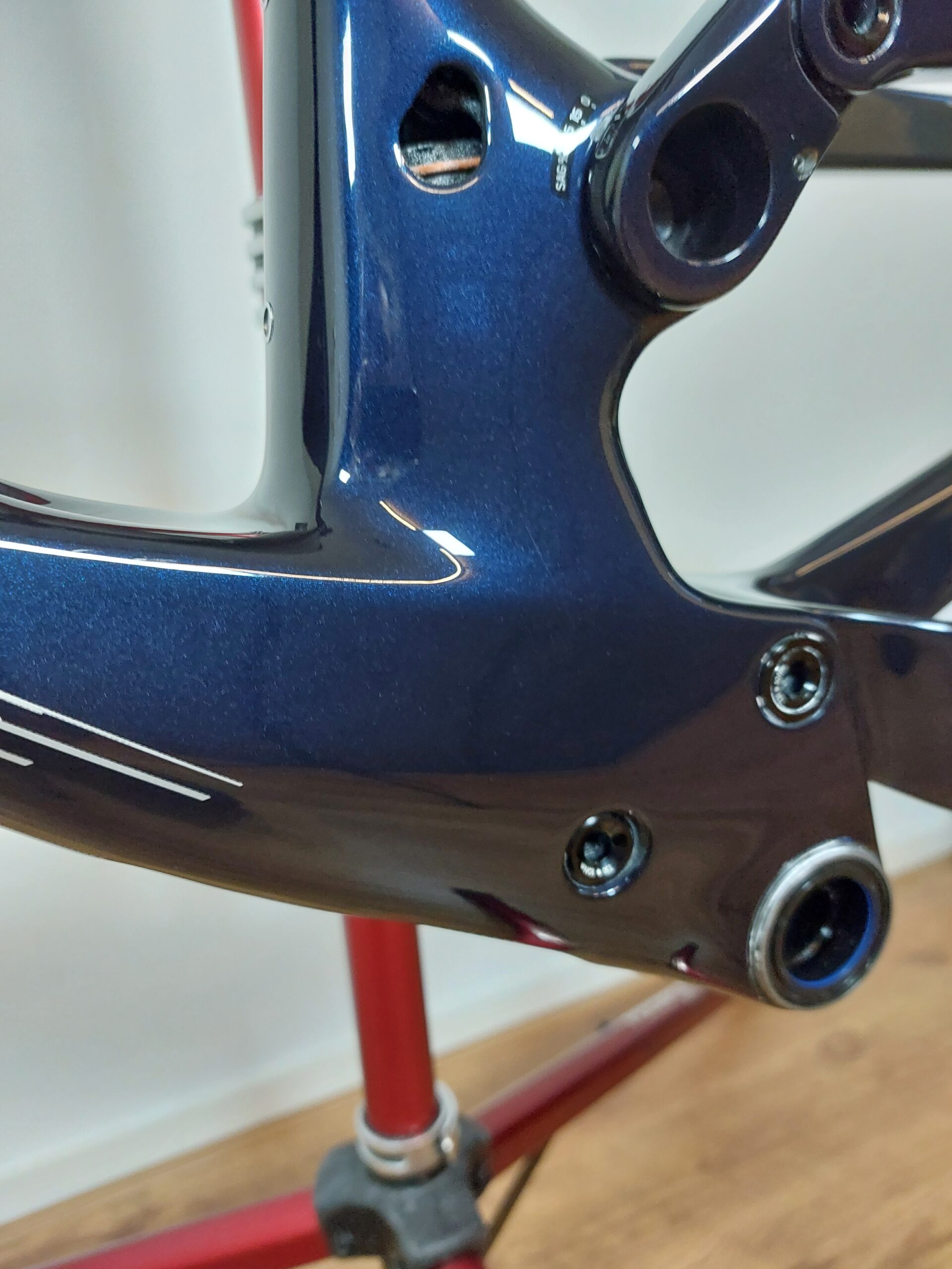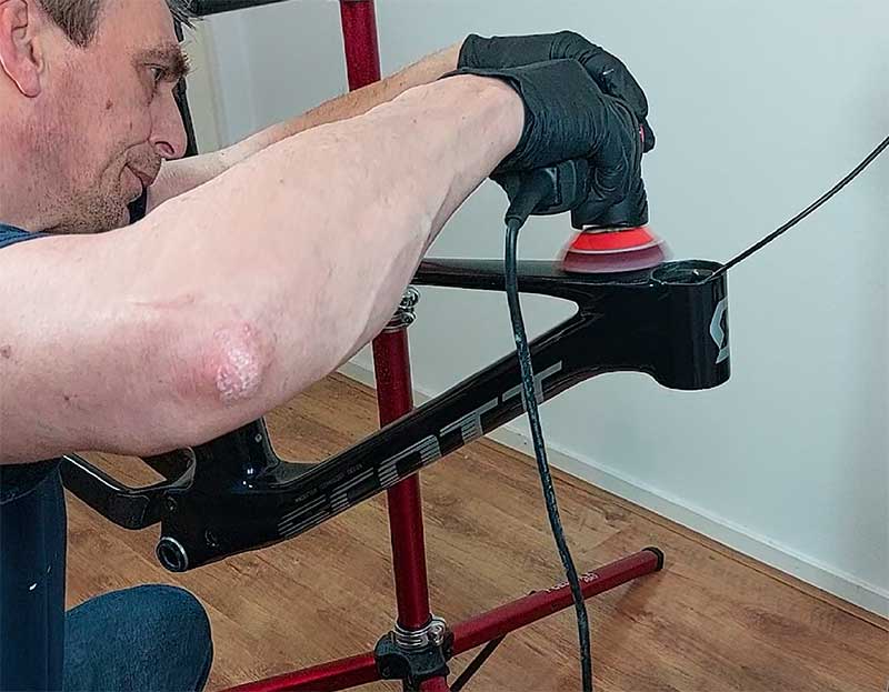 Deze Scott Spark onderging de volledige HQ behandeling. Het frame is in drie stappen gepolijst: Eerst zijn de diepe krassen verwijderd, vervolgens zijn de lichte krassen aangepakt en tot slot is de lak met een fijne polijstpasta naar hoogglans gebracht. Daarna is er een glas coating aangebracht wat de kleur niet alleen nog meer diepte en glans geeft maar ook beschermd tegen lakschade.